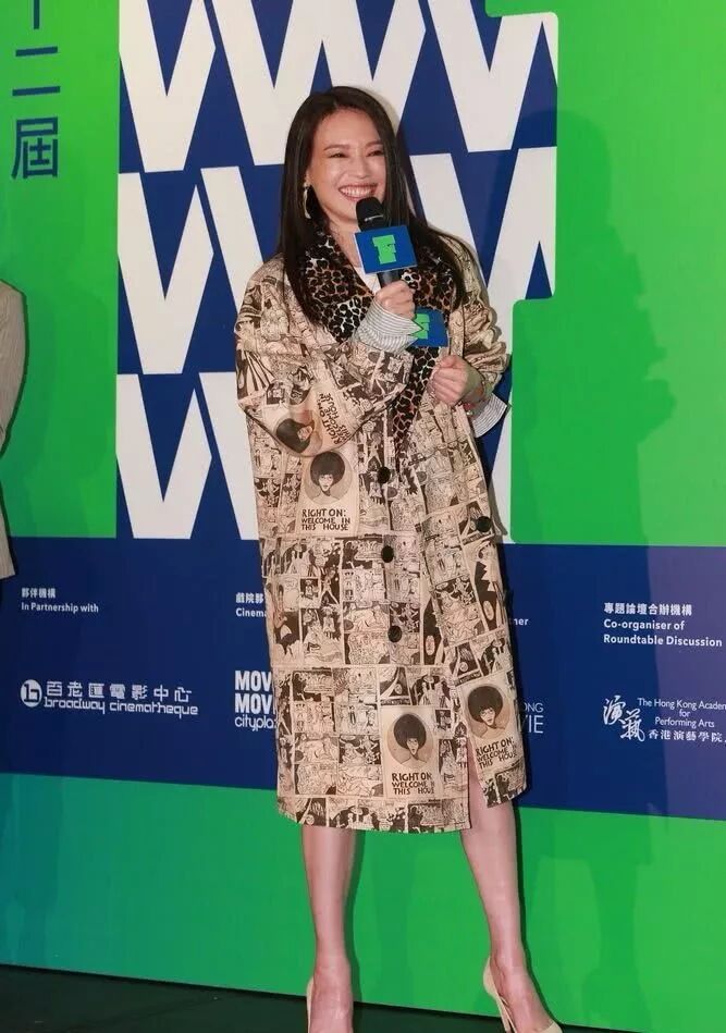 舒淇笑的可真開心,大白牙都出來了特別甜,眼睛也瞇成了一條縫,再看她這件衣服,簡直是移動的海報,比較有年代感,而且她領口還是豹紋比較時尚。