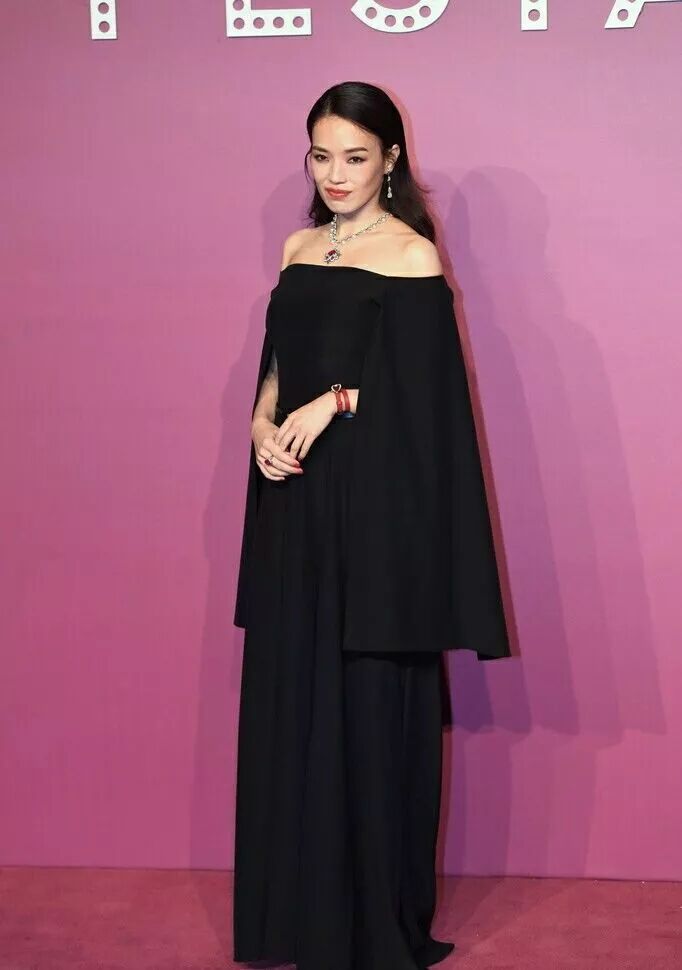 又是一身黑的舒淇,整個人散發出沉悶的感覺,不過這條裙子是一字肩的設計,看起來沒那麼保守,裙子袖口那里採用了披風的設計看起來還不錯。