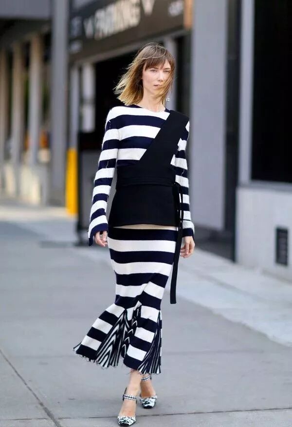 橫行條紋被藏藍色斜切開來,打造腰封的感覺,下面的魚尾裙造型,十分顯身材,不僅如此,還在尾巴上做了褶皺向上凸起的條紋處理,細節真的是做到了極致!