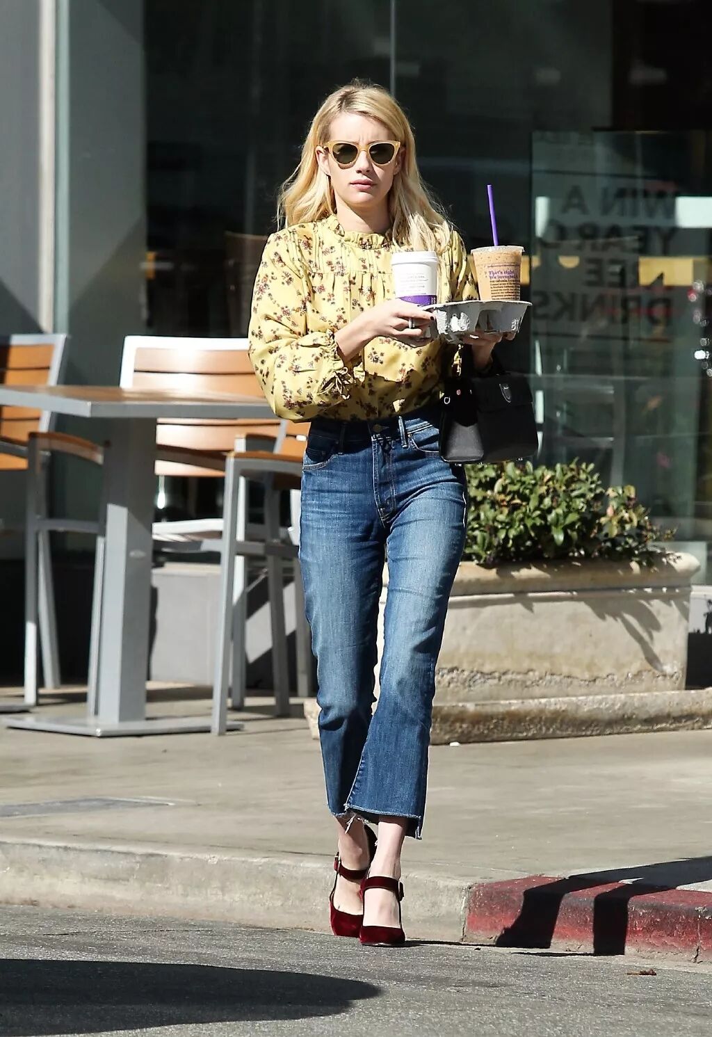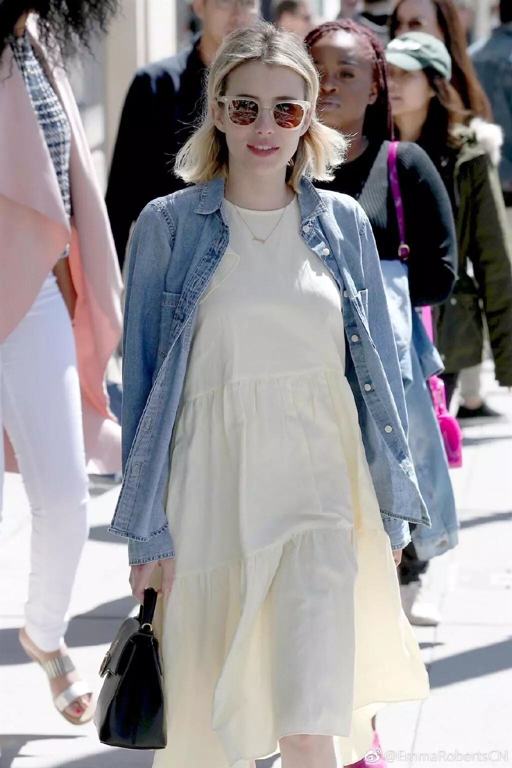 Emma一身小碎花的花領襯衫,全部塞進修身的牛仔褲里,暖黃色的墨鏡和她的一頭金髮相稱得很。