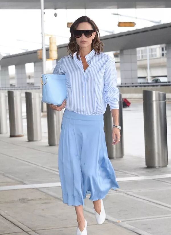 如果沒有藍白色搭配的連衣裙,一件藍白條紋襯衫+水藍色的百褶裙也是很巧妙的組合,同色系的穿搭延續了身線,搭配高跟鞋有視覺拉長的效果哦!