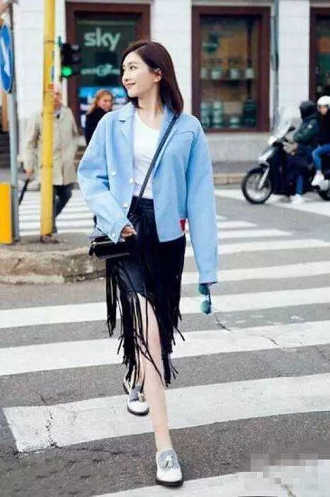 明星的街拍永遠是最日常最時髦的搭配,江疏影藍色小外套搭配乾淨的小白T和黑色流蘇裙,乾淨而清新的模樣,讓人一眼就看到心里去。