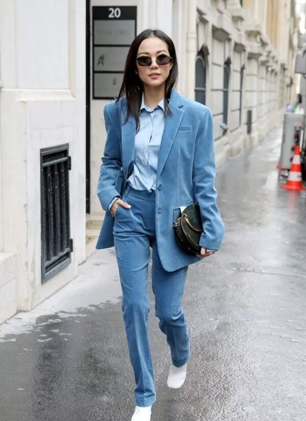 低調的加深上衣的分量感,天氣時冷時熱就可以用藍色絲絨披肩禦寒,套裝的深淺疊搭,讓整體很有層次,絲絨的質感讓人覺得非常舒服。