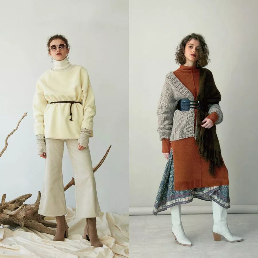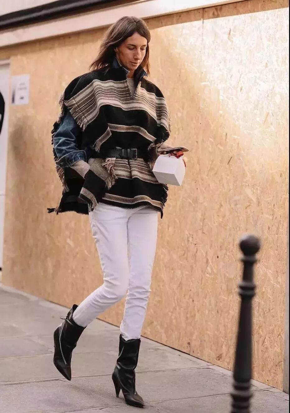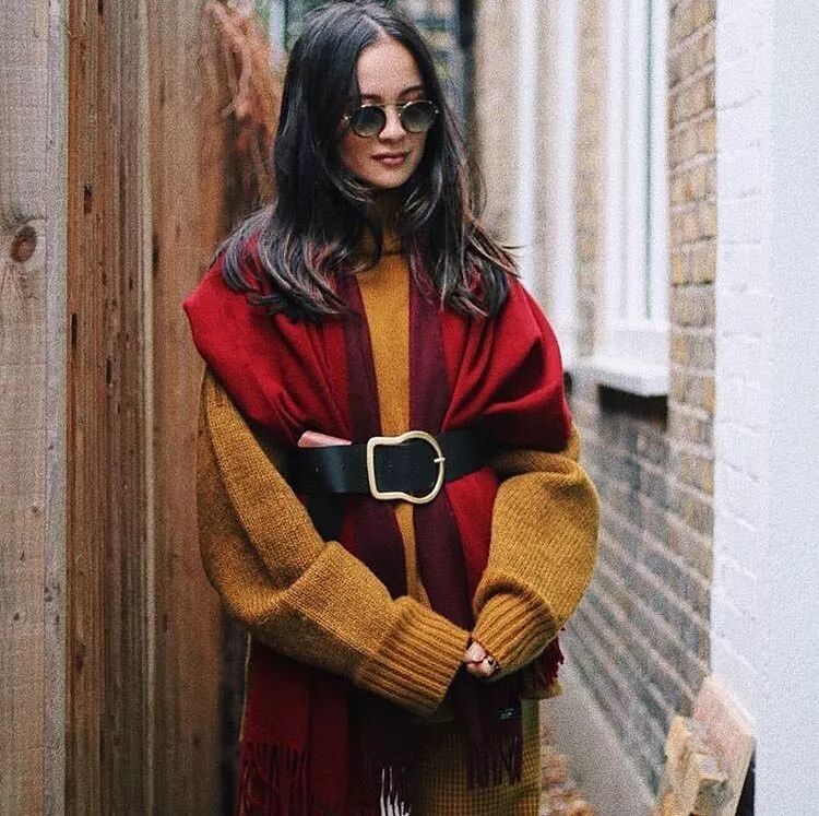 還有這樣毛衫外套披一條大圍巾,也可以用腰帶來固定,使他成為一件小衫~造型上也會非常立體。
