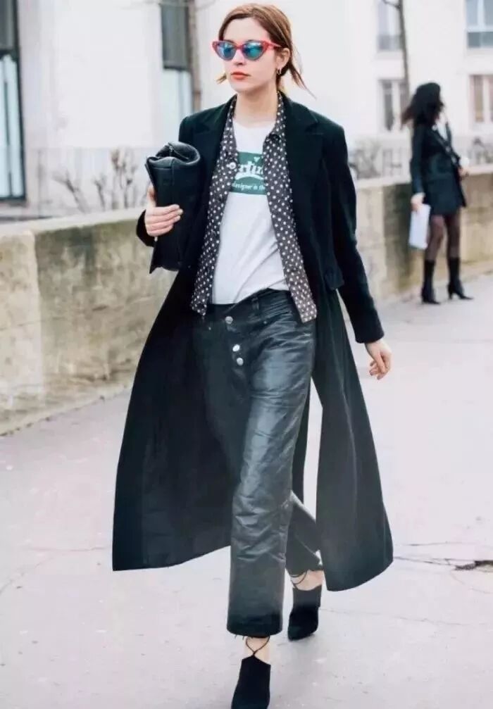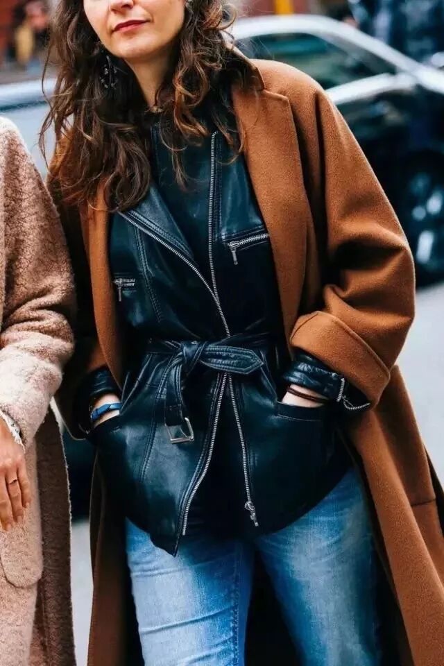 用皮夾克做大衣的內搭帥氣十足,一個炫酷恣意,一個優雅高級,混搭在一起的化學反應就是——時髦得不行!