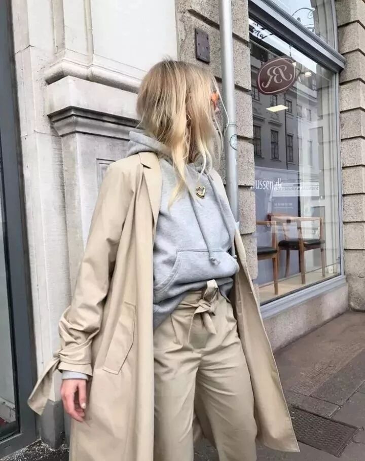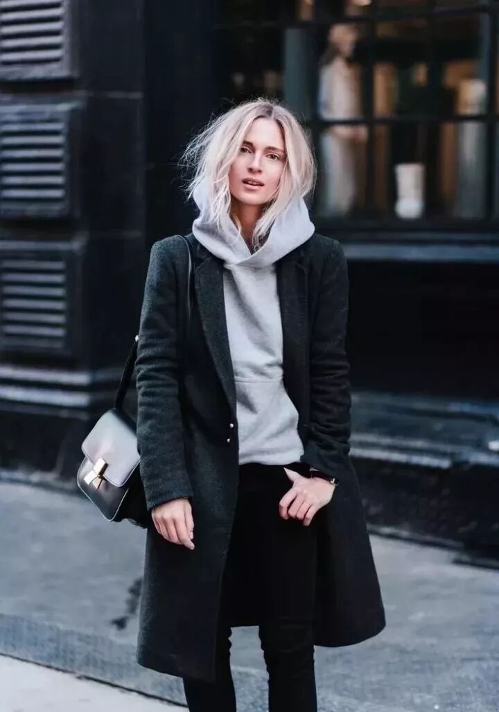 除了毛衣做打底之外,衛衣混搭大衣也是時髦得不行,不像大衣+毛衣那麼成熟,更多的是帥氣中性的休閒感。