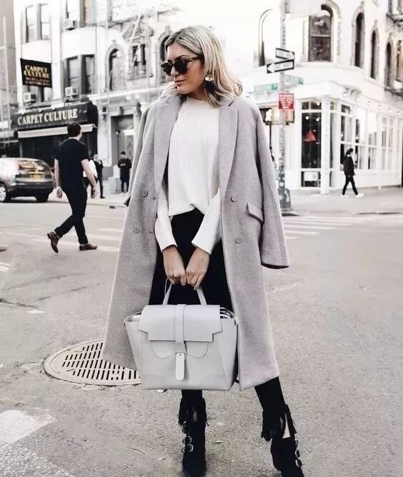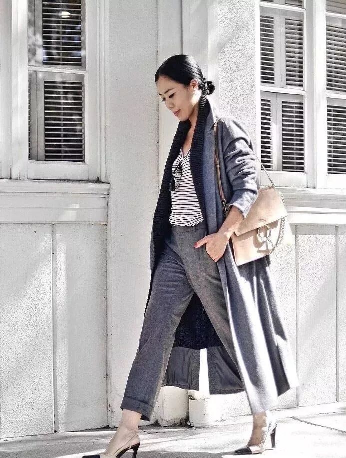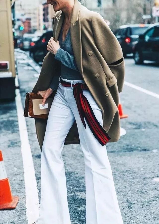 有的女生喜歡用闊腿褲來與大衣搭配,這時候就應該上緊下松,內搭選擇修身毛衣。