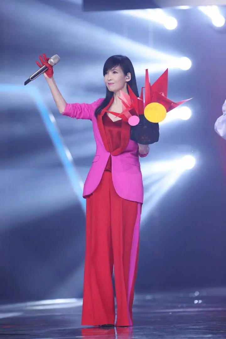 粉色的西裝看起來特別的少女了,內搭的是一件深紅色的衣服和褲子,這樣看起來周慧敏顯得更加的減齡更加的青春
