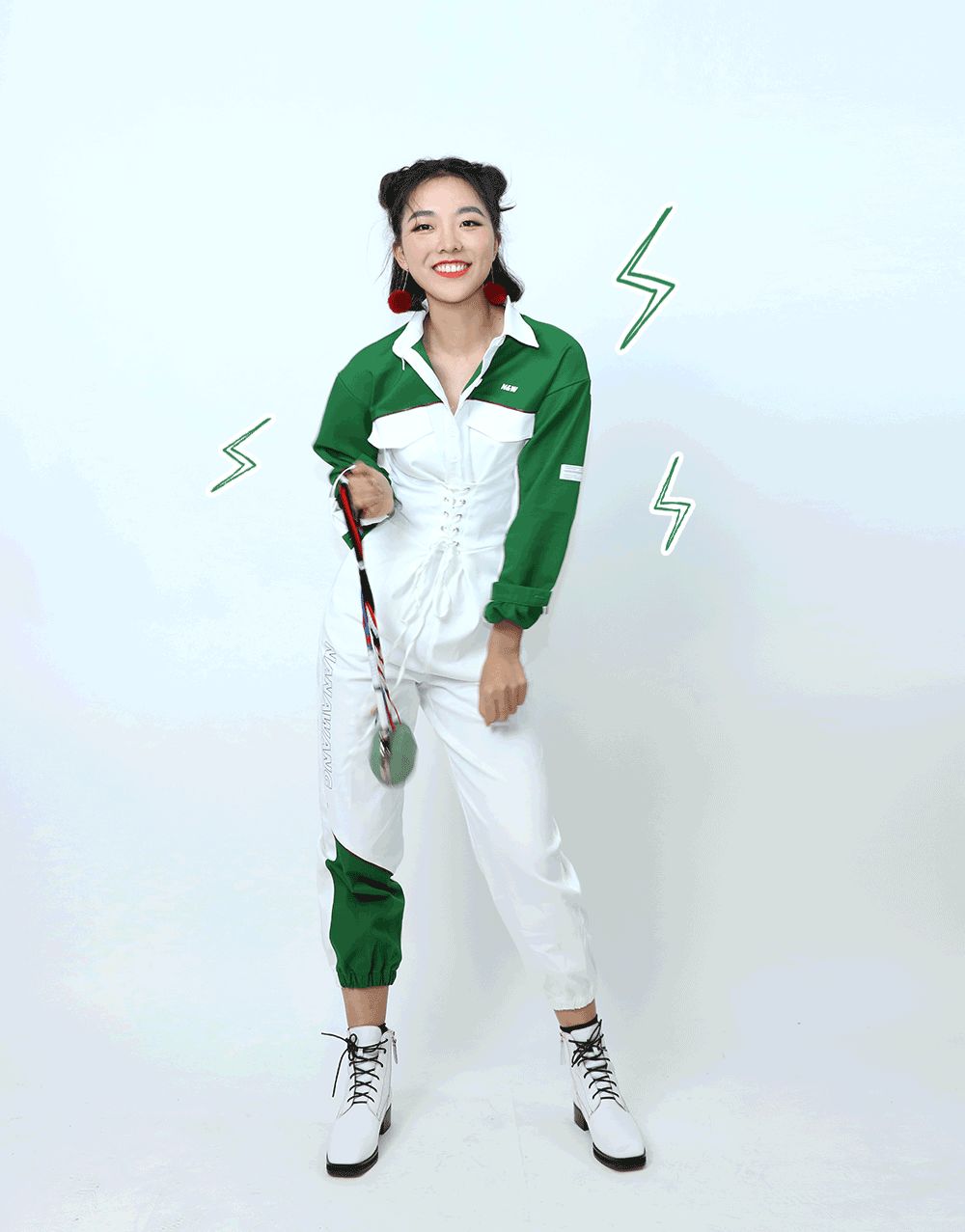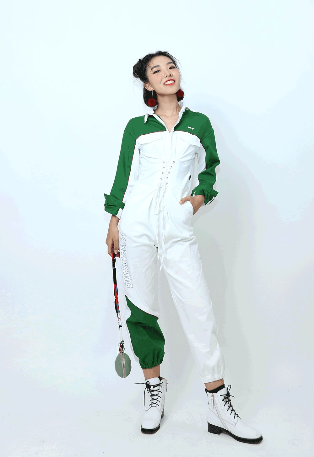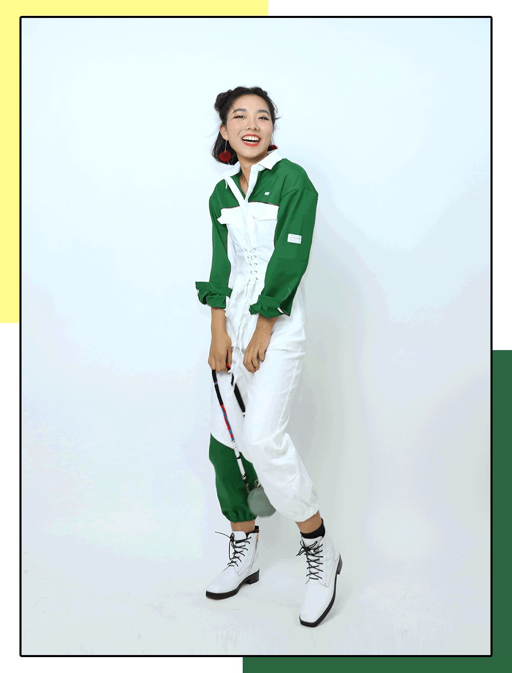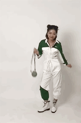 比起男生,她更適合沒那麼硬氣的工裝。給她選了條拼色連體褲,廓形很好,顯得肩寬腿長,最主要腰上自帶腰封,把小細腰大寫加粗地強調一遍。