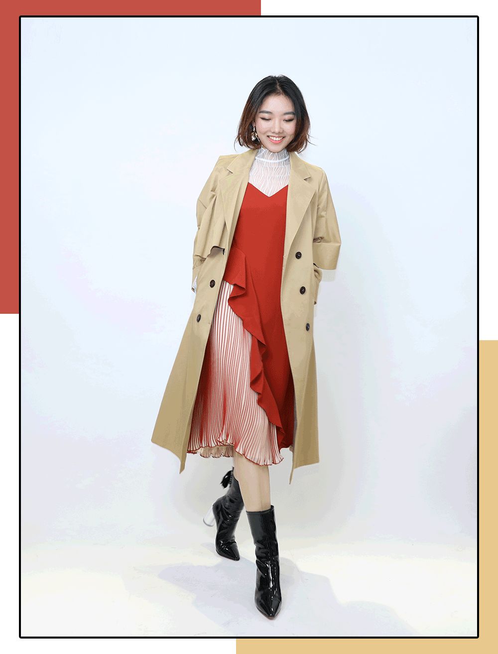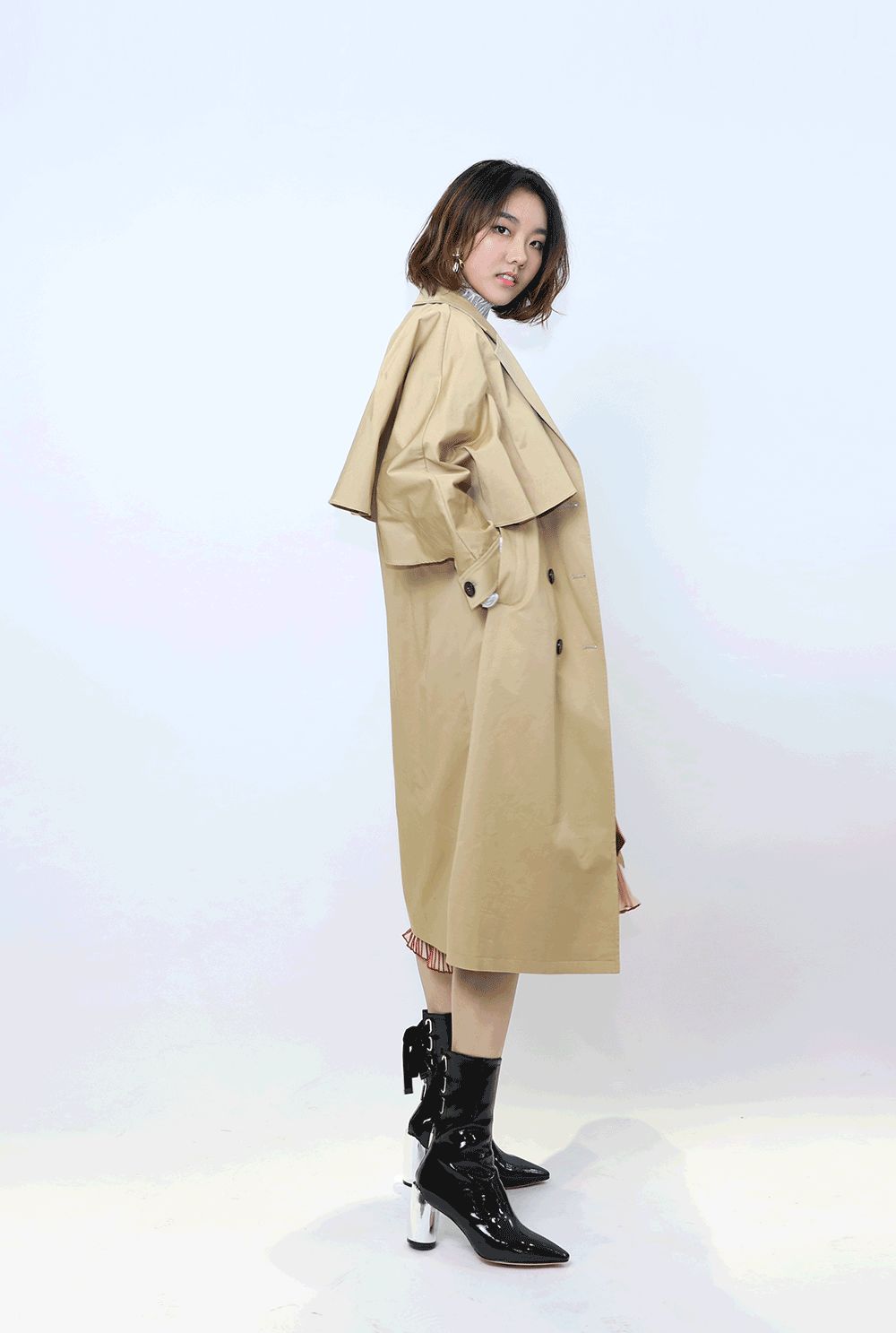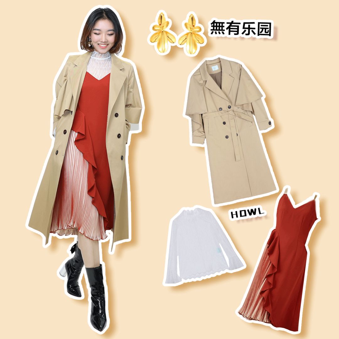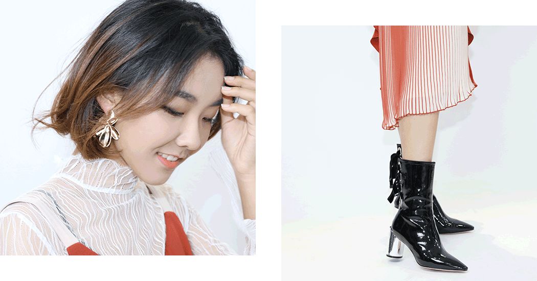 披上風衣就是氣質滿分的金秘書。中筒靴選了上套造型里穿過的那款,大膽露腿肚子的,真的一點也不粗~配飾選了立體的花瓣耳環。