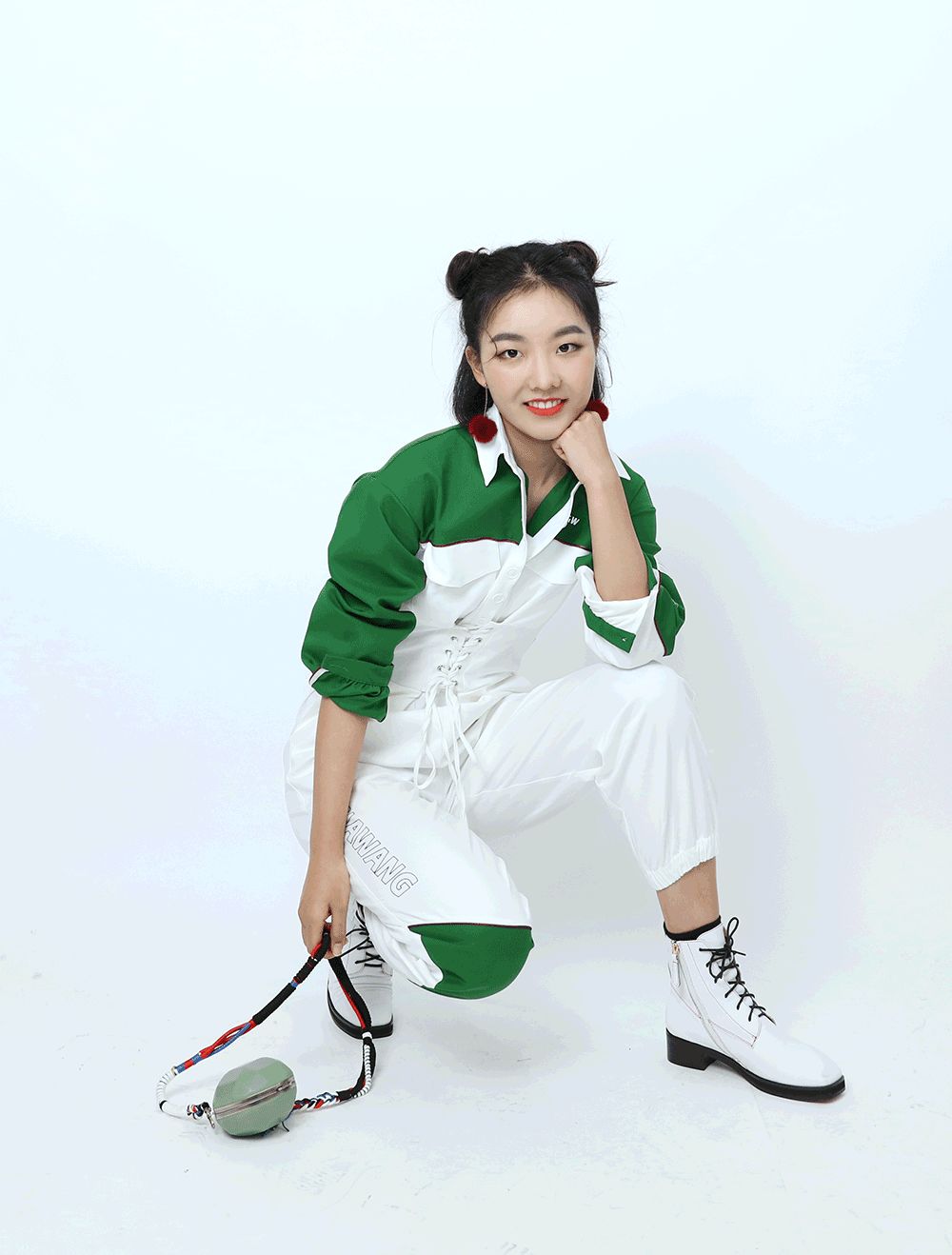 配上撞色的小毛球耳飾,又帥又娘。