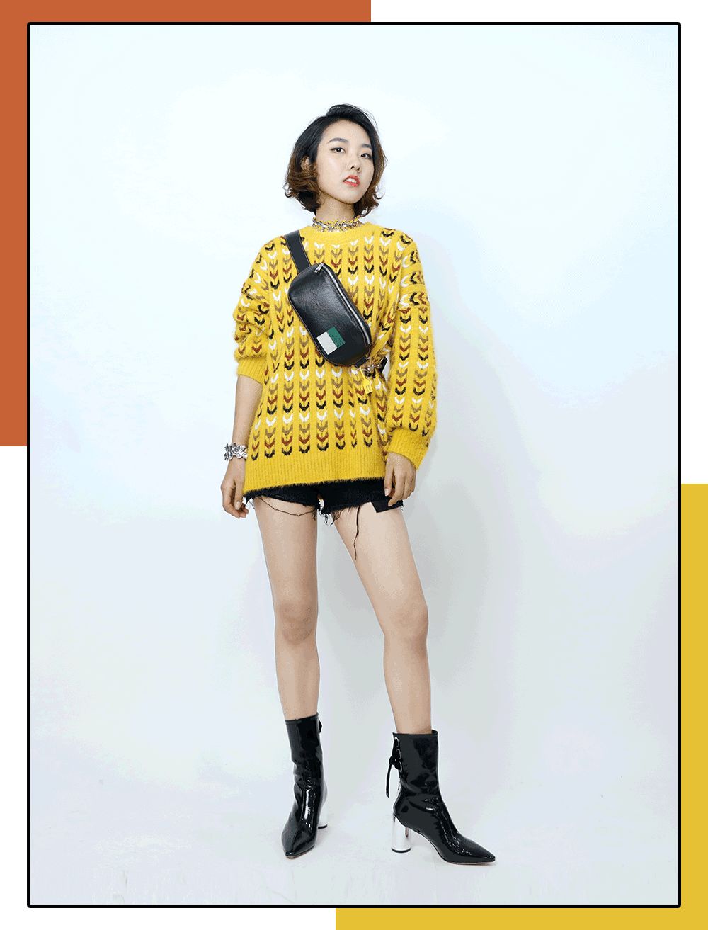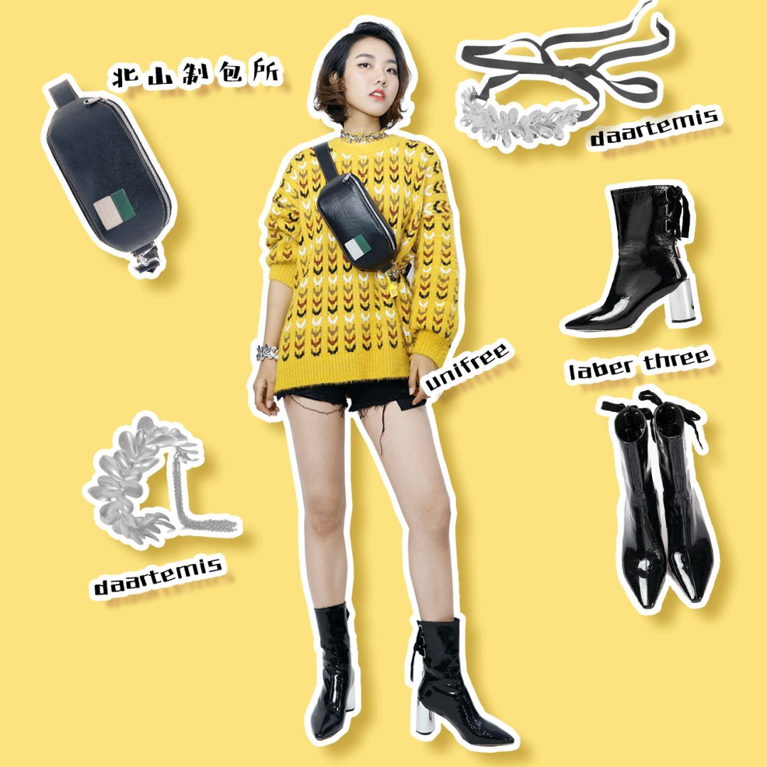 搭拼色麻花的黃色毛衣和很顯腿長的撕邊短褲,酷女孩指數飆增。