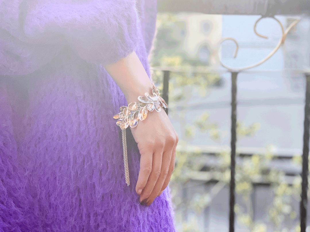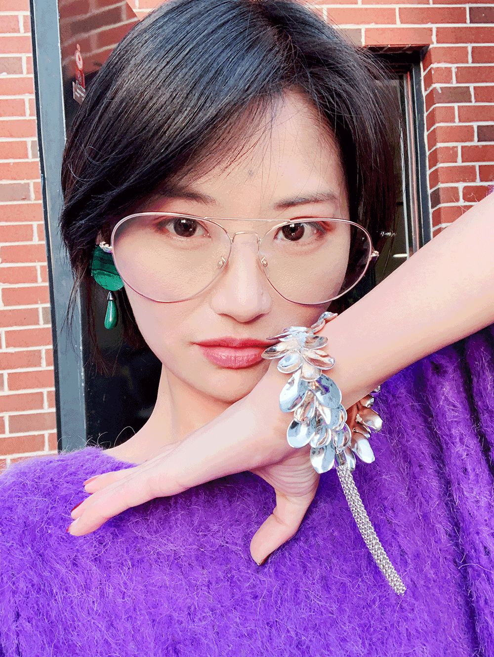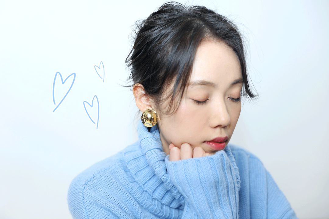 不過穿這種毛衣盡量把頭髮紮起來,顯得乾淨一點。造型師給她梳了個魚骨辮,再在小辮子上戴了一枚戒指。一物二用~耳環戴的是這款金屬小貝殼。