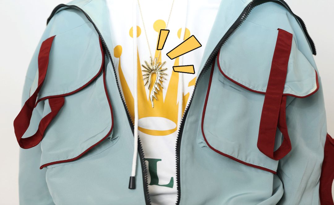 衛衣外面套了條時髦的金鏈子。兩只手各戴了很有設計感的戒指。