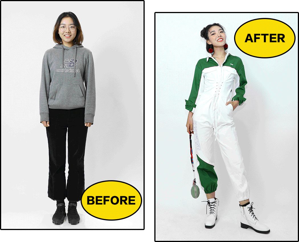 我讓造型師幫她梳上時髦的哪吒頭,眉毛畫得粗點顯臉小。眼妝幫她保留了有特色的單眼皮。開始幫她改造。