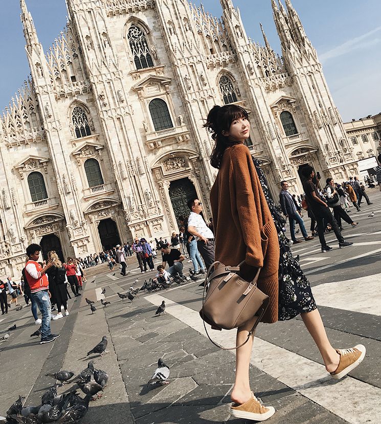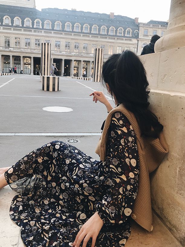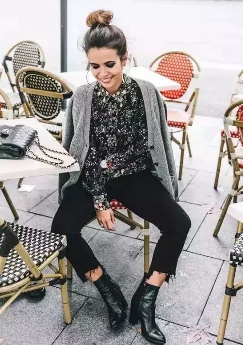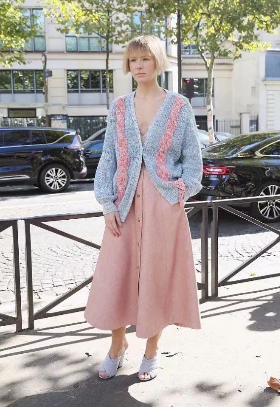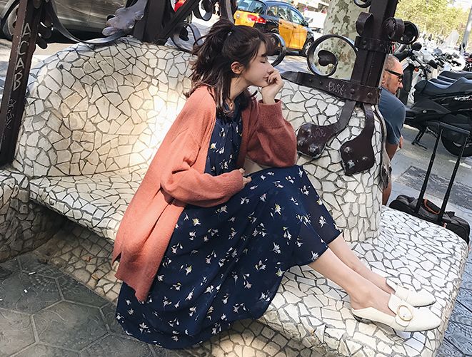 純色開衫搭配花裙子,也是仙女們的標配,不過要注重色彩上的協調,選擇同色系的針織開衫才能使造型不凌亂。