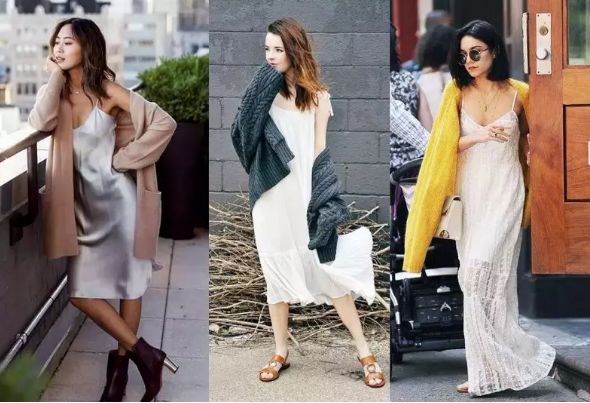 長款針織開衫+吊帶連衣裙是非常有女人味的穿衣方式。