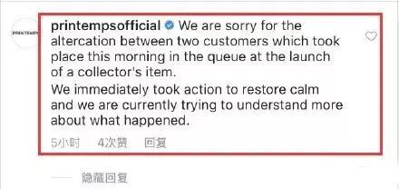 「對於今早新品發售出現的客戶爭執,我們表示非常抱歉。我們已經採取了必要的措施來平息兩個顧客間的爭端。現在我們正在通過多種管道更多的了解事實真相。」