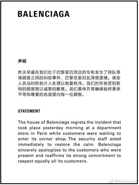 聲明內容:「昨天早晨在我們位於巴黎某百貨店的專櫃發生了排隊等候顧客之間的糾紛事件,巴黎世家對此深感遺憾。保安人員當時即刻介入處理以恢復秩序。我們對所有受到影響的顧客致以誠摯的歉意。我們重申並將確保始終秉承平等和尊重的態度面向每一位顧客。」