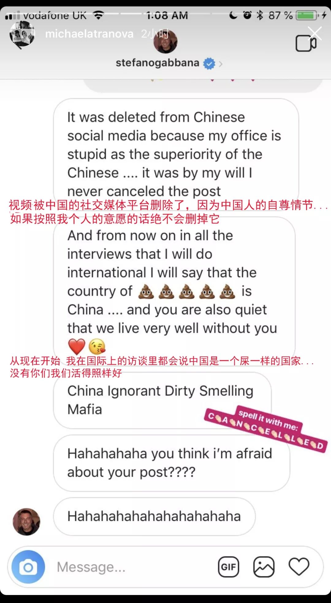 2018年11月21日,一段網友與DG設計師Stefano Gabbana在社交網路的對話曝光,設計師措辭激烈疑似辱華。隨著事件發酵,新浪時尚目前接到官方最新消息:本將於21日晚在上海舉行的品牌大秀正式取消。