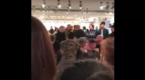 從視頻中不難看出,現場十分混亂,消費者保安扭打在一起,導致發售取消。