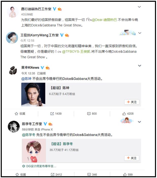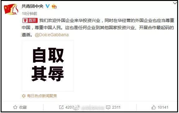 共青團中央也發布微博稱:「我們歡迎外國企業來華投資興業,同時在華經營的外國企業也應當尊重中國,尊重中國人民。這也是任何企業到其他國家投資興業、開展合作最起碼的遵循。」並艾特Dolce & Gabbana官微。