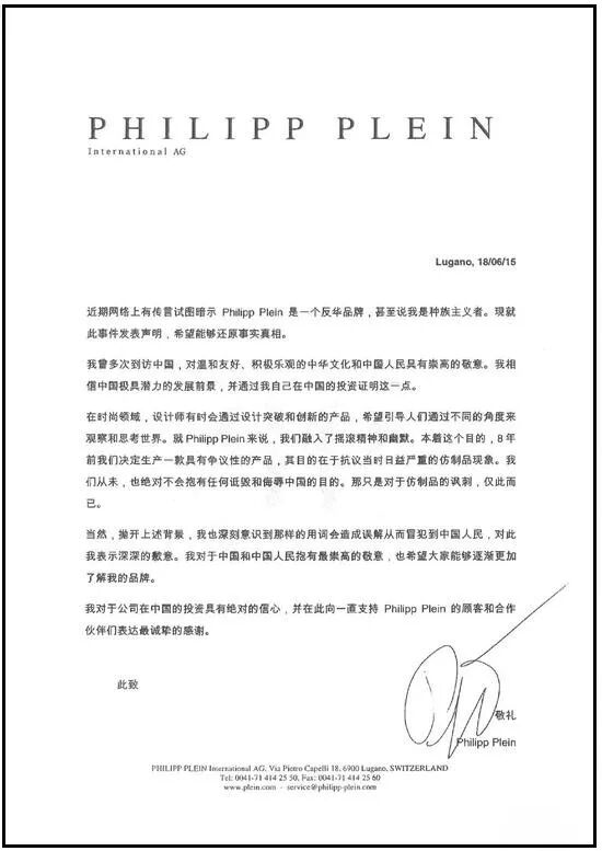 Philipp Plein方面回應「不想隨大流,加入生產廉價時裝及服裝的時代潮流」,想說明「Philipp Plein決不造假」,是以幽默的形式諷刺仿制品。對於這個公關文,自然是沒人買單的。Philipp Plein在發布這條聲明後,微博關閉評論,至今仍未開啟。