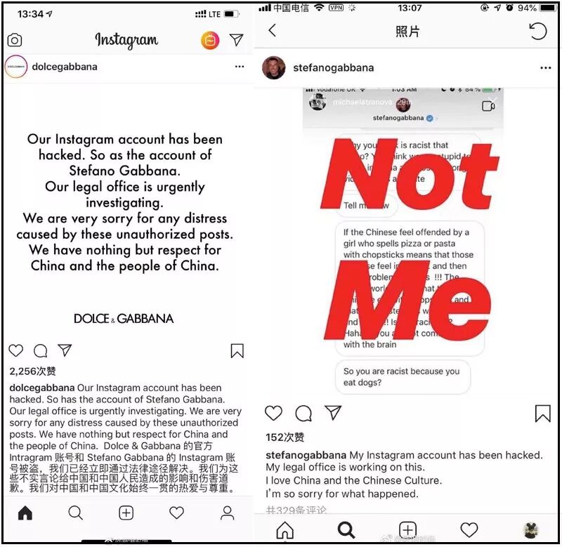Dolce & Gabbana辱華言論持續發酵中,設計師以及品牌官網在社交媒體上回應本次事件說:社交媒體「被盜號」,法務正在緊急調查之中。