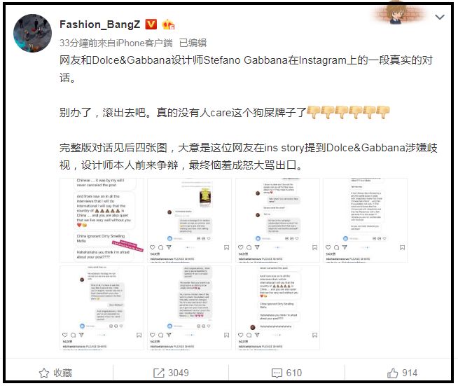 去年四月,Dolce & Gabbana微博官方帳號上發了一系列標籤為「#DG愛中國#」的行銷視頻和硬照,模特穿著Dolce & Gabbana的時裝,站在天安門和老城區里,樸素的路人融入其中。不過這組照片卻在微博上引起軒然大波,被認為有醜化中國人之嫌。
