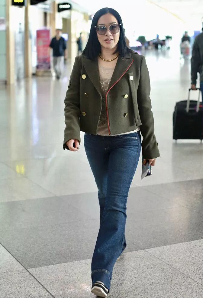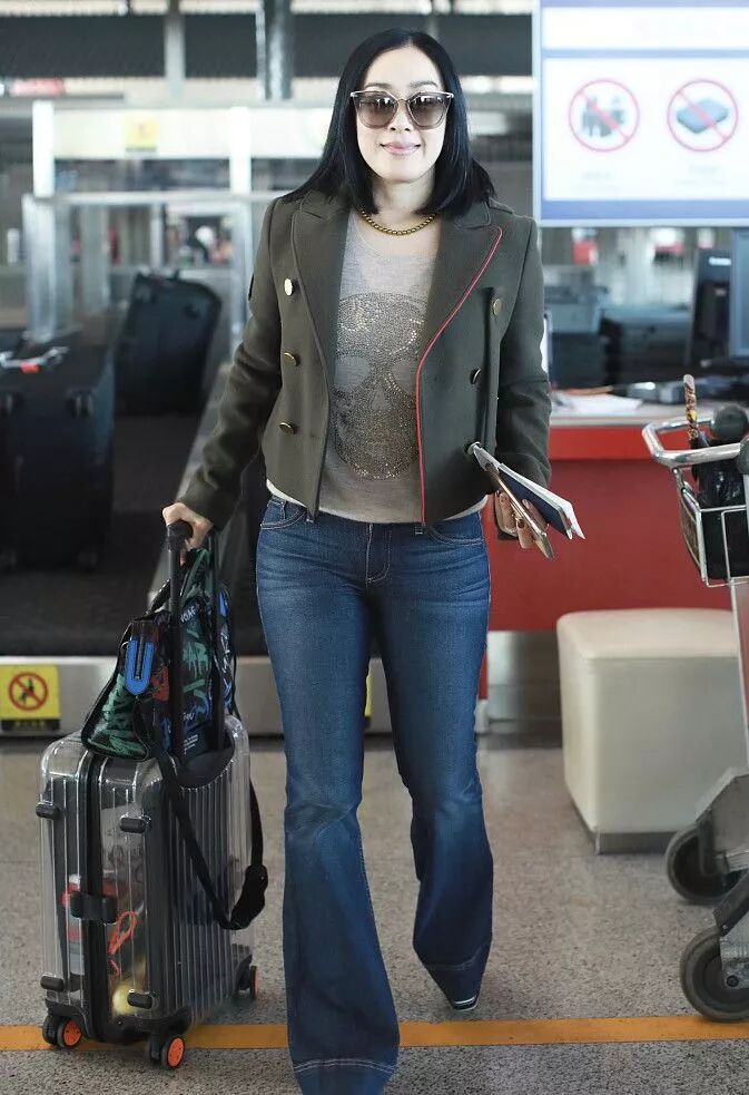搭配一件綠色超短上衣,看起來更加精致,同時搭配的寬鬆褲子,讓自己更加高挑,機場里穿著很洋氣,只可惜身材是硬傷。