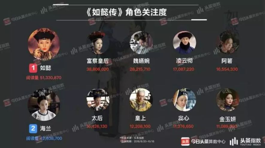 此前,頭條曾經出具過關於《如懿傳》的相關數據報告,從流量、口碑、話題討論上對大眾關注重點進行解讀,得出了海蘭的關注度高於乾隆的結論。類似這樣的結論對於劇集播出時的宣傳也將會起到很好的指導作用。