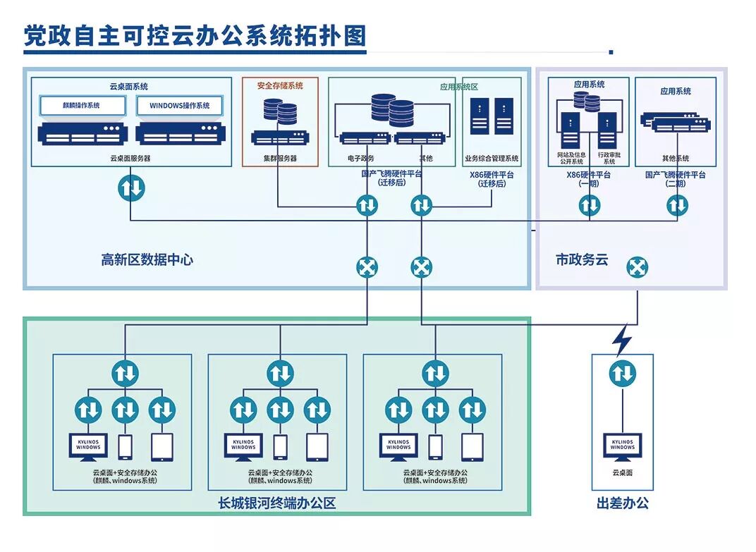 據現場麒麟公司技術人員介紹說,這次部署的是虛擬桌面系統,又稱雲桌面模式。國際上信息系統架構正從「計算機+網路」模式向「雲+端」模式發展,雲計算下的虛擬桌面技術快速發展,雲桌面已成為和傳統PC桌面相並列的新模式。在大陸政務系統國產化的進程中,採用這種虛擬桌面模式,由於計算和存儲統一放在後端數據中心,不僅可以縮短實施周期、減少運維人員降低系統運維成本,還可以解決國產軟硬件不斷升級換代帶來的業務中斷以及系統大批存量Windows應用短期內難以遷移問題,有效解決目前國產化進程中桌面一台國產、一台非國產的「兩台電腦」問題,避免「兩台電腦」現象帶來的業務隔裂困境。