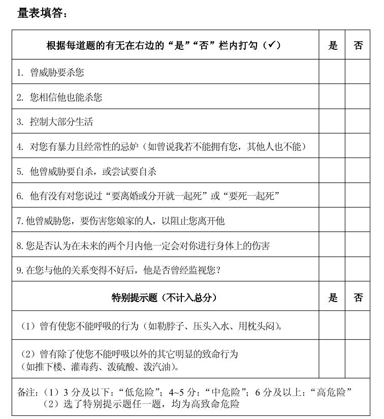 還有可以從對方的家庭環境去識別,比如他的父母是否也是暴力頻發,如果是這樣,他發生暴力的可能性會大些,但也不是絕對。實在不行還有危險評估量表,去評估自己是否處於危險狀態,比如他是否威脅要自殺、是否威脅要對你的行為進行控制、他是不是要威脅殺掉你的娘家人等。
