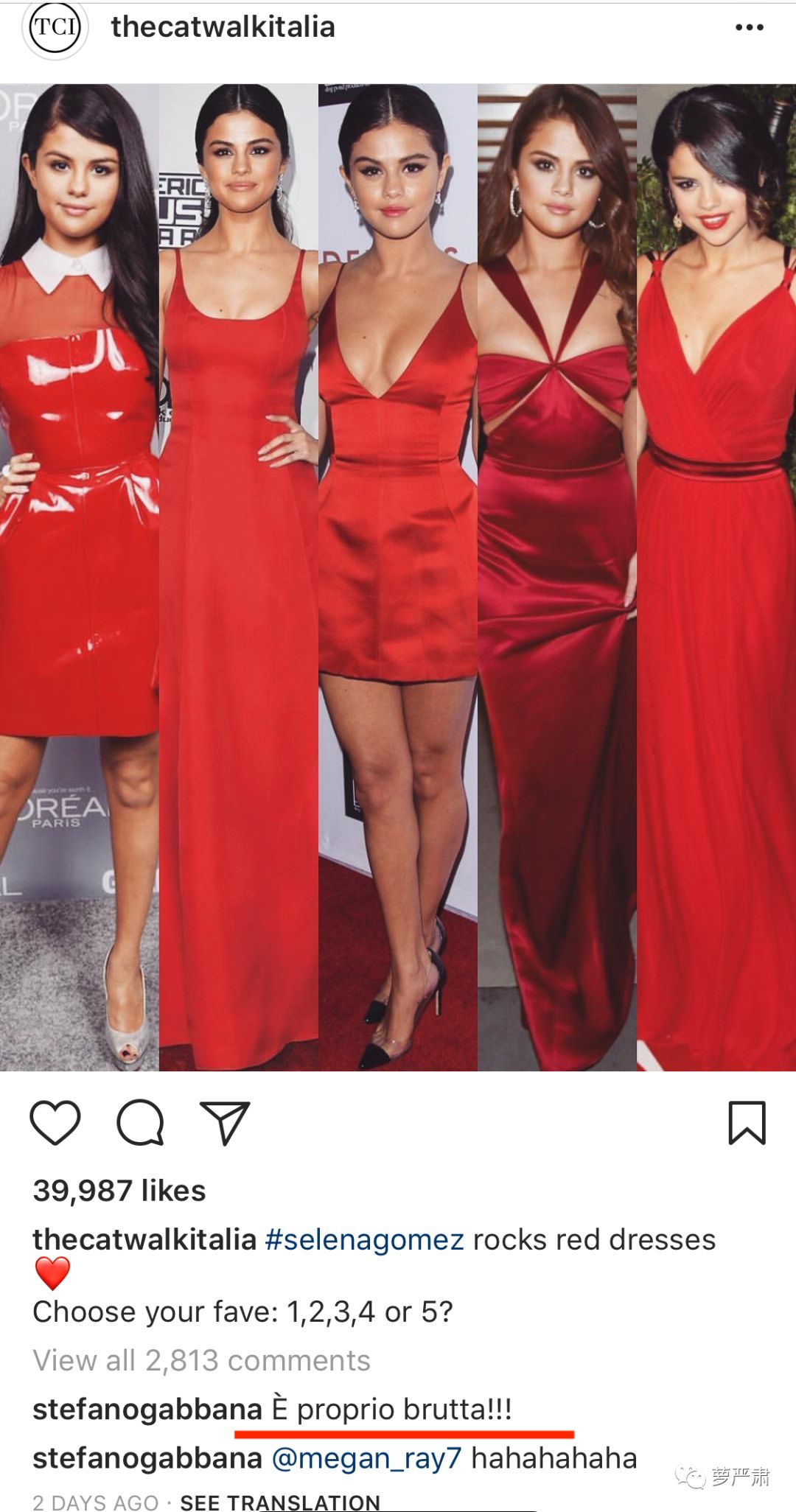 今年6月,他跑到其他時尚媒體的帳號發的賽琳娜(Selena Gomez)美圖下面說義大利文留言「è proprio brutta」,意思為「她好醜」。