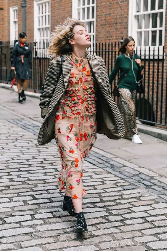 印花裙與馬丁鞋,帥氣與優雅的結合,打造出個性時髦的娘man風格。