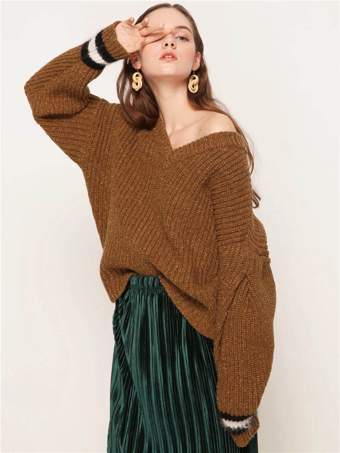 另外,焦糖色也是秋冬必備。再加上是V領,馬上告別毛衣的臃腫感。