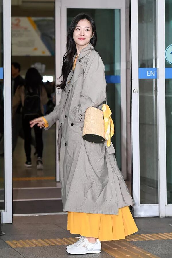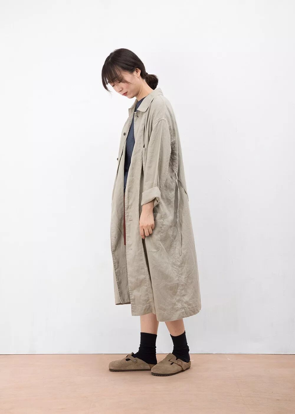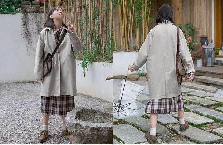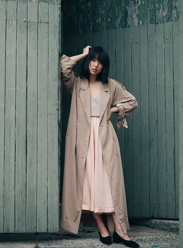 當裙子長度比風衣長很多的時候建議系上腰帶,揮著敞開來穿,這樣才不會影響身材比例。