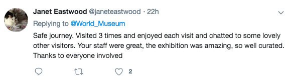 「一路順風哦,我去了3次,每一次都有很好的體驗,還跟其他一些可愛的觀展人交流。世界博物館的工作人員也很好,展覽驚艷,策展上佳,感謝所有人。」