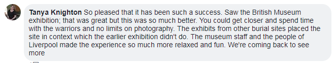 「真高興展覽這麼成功,我看過之前大英博物館的兵馬俑展,那個也很好,但世界博物館這次展覽更好,離得更近,有更多時間和兵馬俑在一起,還不限制拍照。工作人員和利物浦人讓氛圍變得更輕鬆愉悅。」