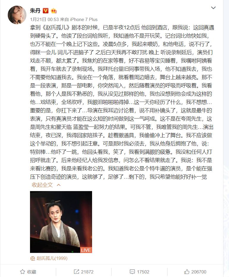 朱丹的微博也經常分享自己的心路歷程,不管周一圍有什麼動態,朱丹都會第一時間趕過去支持。