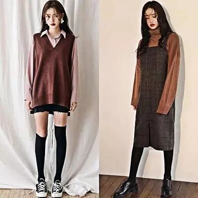 咖啡色oversize高領針織衫作為內襯,外面一件格紋吊帶裙,非常復古。