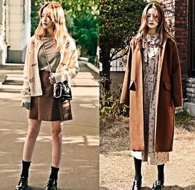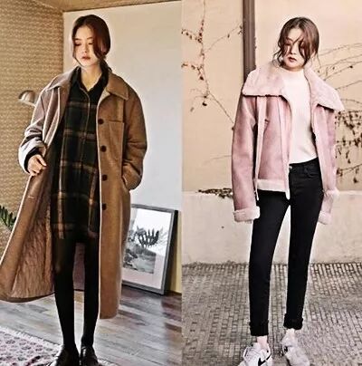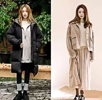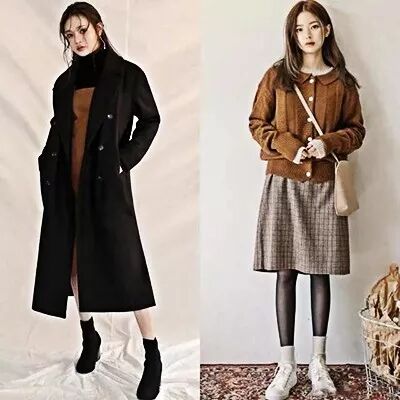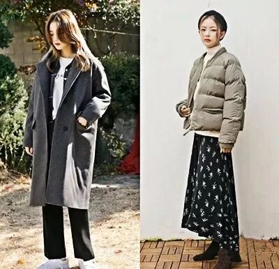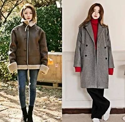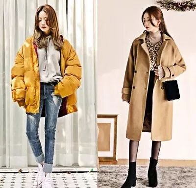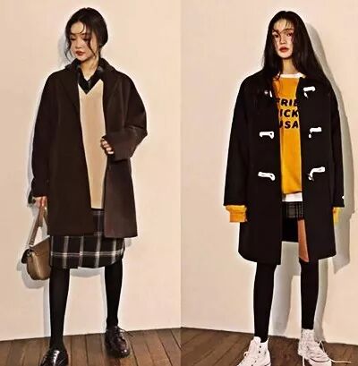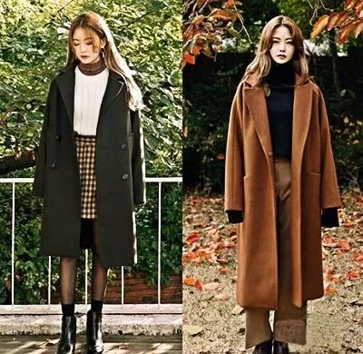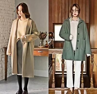 這是兩件非常有質感的大衣,墨綠色和卡其色在韓國很流行,墨綠色顏色偏淡,可以搭配白色,在視覺上會有一種色差感。