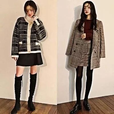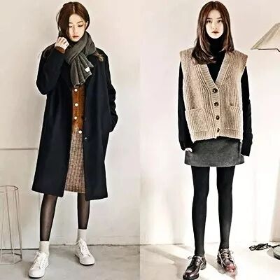都說韓國的女生一年四季很愛露腿,這下算是見識到了,偏暗的色系穿搭,一條圍巾,一件藏青色大衣,內搭棕色針織衫和格紋短裙,文藝少女架式。