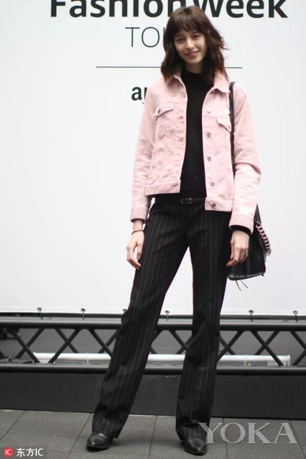 江疏影的粉色牛仔外套,搭配黑色緊腿褲和白色平底鞋,非常耐看。