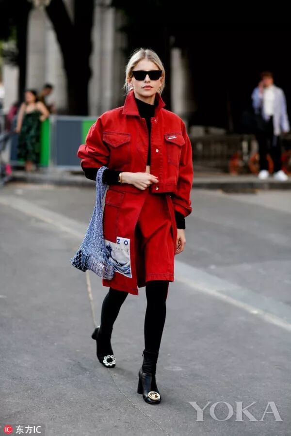 紅色牛仔套裝,下面搭配黑色緊腿褲+小靴子,混搭的效果也是十分時髦。