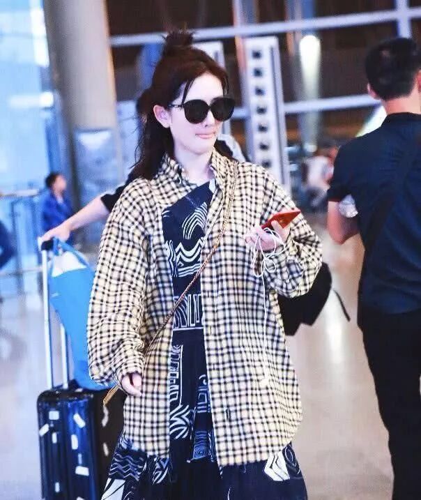 謝娜的半丸子髮型,格外可愛,讓機場里的她更加接地氣,同時身穿格子襯衫上衣,寬鬆的裙子,看不清身材,機場里過於隨意。