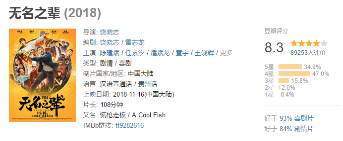在《我不是藥神》之後,11月的國產電影里邊又奔出了一匹小黑馬《無名之輩》。沖著章宇任素汐去看的,雖然小毛病也不少,但瑕不掩瑜,能讓人笑得哭,哭著,又笑了。目前口碑說是爆棚也不為過,豆瓣評分8.3,跟國產同類型電影中的老大哥《瘋狂的石頭》齊分。