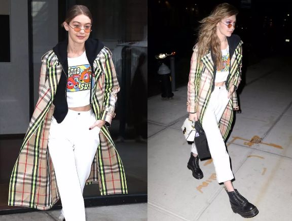 另外,各種風衣的不同配色或材質都會呈現不一樣的效果,比如GiGi這種帶有熒光色的格紋風衣,就會顯得更有層次感。
