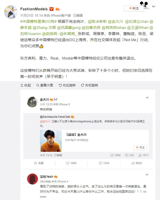 國模退出、明星聲明、官媒報導、品牌大使取消合作,最終大秀取消,而D&G相關詞條在微博熱搜榜上掛了三天。盡管D&G當天聲明稱「設計師被盜號」,品牌名聲已經無法挽回。