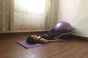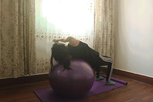 背部緊貼瑜伽球,雙手可以握一個小的啞鈴或瓶子,來回旋轉身體,堅持5分鐘。